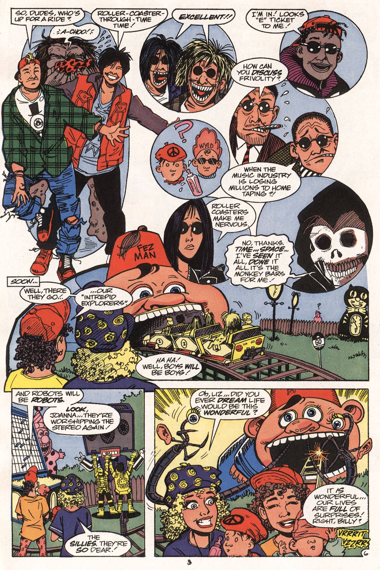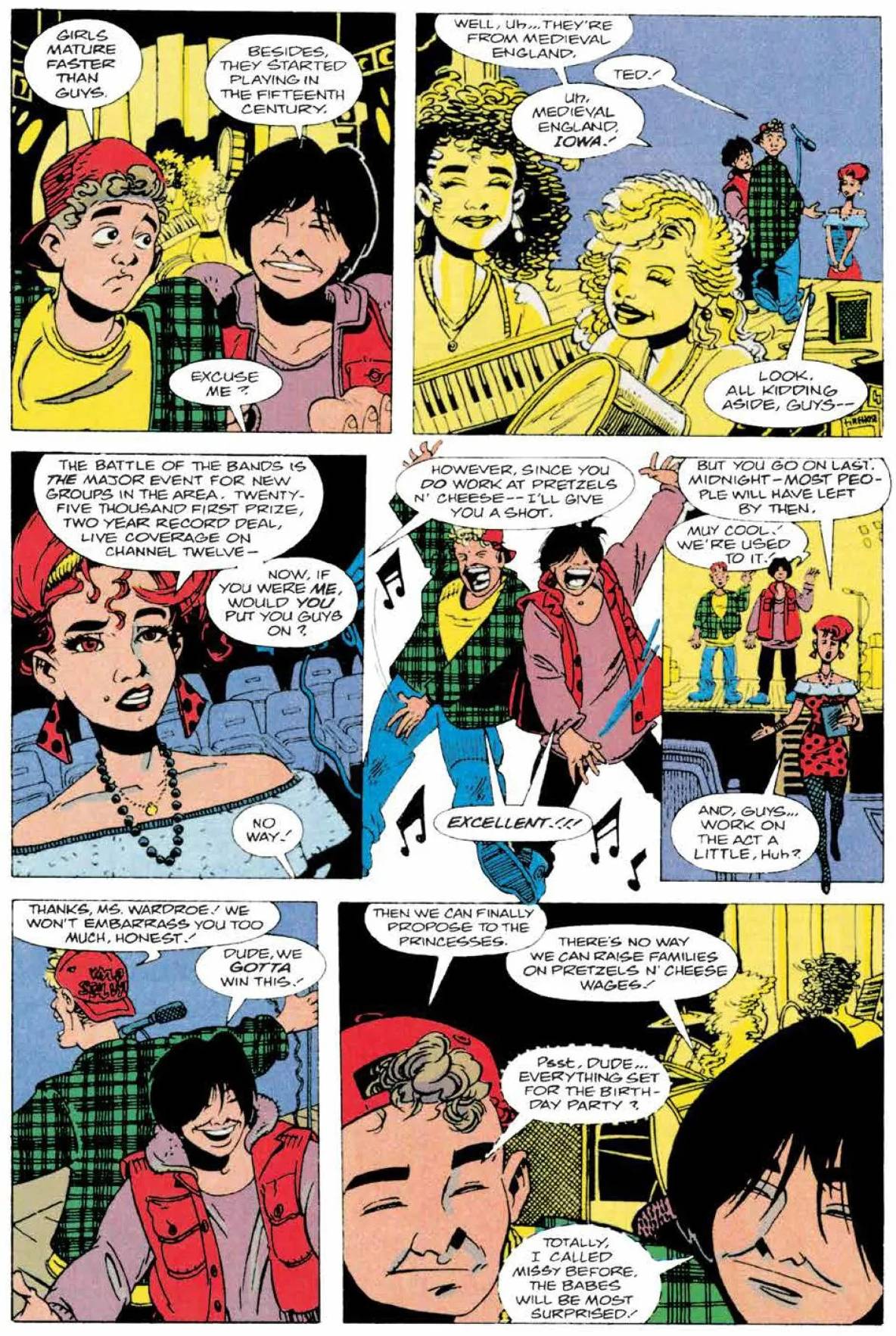 Dorkin retoma y adapta perfectamente el humor absurdo e inocente de las películas, y lo traslada al formato comiquero con mucha naturalidad; de hecho las propias características de las historias de Bill y Ted se prestan con mucha facilidad para desarrollar el tipo de historias que suelen ser moneda corriente en los comics: situaciones disparatadas, viajes en el tiempo, team-ups con personajes históricos (Bill y Ted se hacen amigos de Billy The Kid, Napoleón Bonaparte, Abraham Lincoln y Sigmund Freud, entre otros), dopplegangers, robots, princesas (dos princesas medievales que se conocieron en la segunda película y con las que se casan), y una amistad con la propia Muerte, quien al final del primer número, decide renunciar a sus tareas para irse de vacaciones.