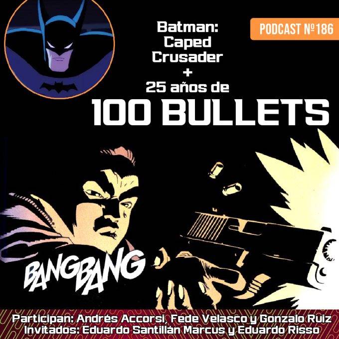 En el primer bloque, te proponemos un viaje al corazón de 100 Bullets, el clásico de Vertigo que cumple 25 años, junto al especialista Eduardo Santillan Marcus, más un testimonio exclusivo del maestro Eduardo Risso. Para el segundo bloque, viajamos a Gotham City para adentrarnos en Caped Crusader, la nueva e impactante serie animada de Batman. Y para el final, como siempre, tenemos el bloque de las Recomendaciones. Y canciones. Y algún chivo. Y por ahí algo más. Nos faltó el bloque de los coloristas, que va a volver más adelante.