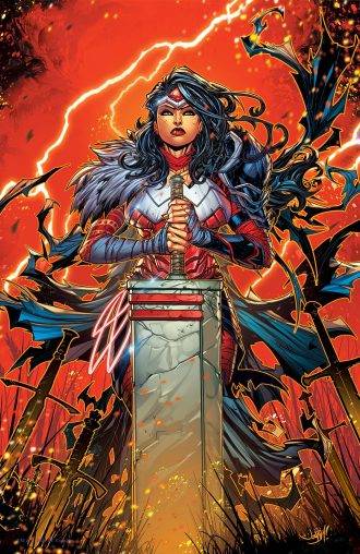 Lo que me resultó particularmente atractivo del título que elijo reseñar este mes es la capacidad de la guionista, Kelly Thompson, para subvertir las expectativas una y otra vez. Cuando todos tuvimos acceso al material promocional de la movida de Absolute, el diseño utilizado para Wonder Woman fue uno de los que más llamó la atención: una enorme Amazona repleta de tatuajes tribales, con una capa de piel barbárica, una armadura de placas y una espada con una hoja tan exageradamente grande que remitía automáticamente al protagonista de algún videojuego tipo Final Fantasy. Estaba claro que, siguiendo la línea editorial pautada para este nuevo universo paralelo, íbamos a tener la versión más violenta y pica-carne de Diana de toda la historia de la editorial, una guerrera imbatible de pocas palabras y armas tomar, que corta cabezas primero y pregunta después.