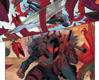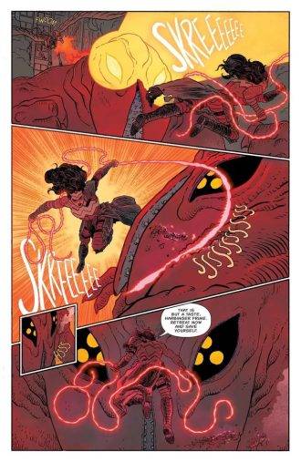 En el apartado artístico tenemos el brutal combo formado por Hayden Sherman y cierta colorista que no voy a tardar en mencionar. El primero tiene sobre sus hombros un par de Detective Comics, un par de números de Predator vs. Wolverine, un número de Batman: Urban Legends y varias colaboraciones, pero no me cabe duda que aquí nos entrega su mejor trabajo hasta la fecha, con una narrativa y un diseño de personajes que denota influencias del mismísimo Moebius y también de dibujantes contemporáneos como Frank Quitely. Sherman hace gala de un dominio de la acción y la violencia que al menos a mí me remite a ciertas influencias del manga. Este precioso coctel se combina con unas imaginativas composiciones de página que no entorpecen para nada la narración y que denotan un dibujo embellecido por alguien cuyo trabajo conozco de sobra y nunca me canso de admirar: la abonada número uno del Maldito Mainstream que no pasa más de dos o tres meses hasta que vuelve a aparecer, la querida Jordie Bellaire, quien aquí recurre a una paleta de colores algo sobria pero muy acorde con el tono de la serie. Incluso en los flashbacks del pasado en el Infierno le otorga a las páginas una especie de delicadeza sobrenatural que transmite a la perfección esa sensación de estar en otro mundo.