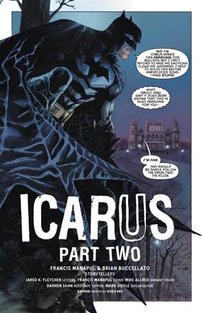 Manapul y Buccellato largan con Icarus en el nº 30, una saga de 5 partes que incluye todos los elementos que nos enamoraron de este personaje, dispuestos de manera sencilla y bien orquestada, y ubicados de forma tal que el lector promedio puede entrarle sin saber demasiado de lo sucedido en los meses previos al arribo de estos artistas. Bruce está lidiando aún con la depresión por la pérdida de su hijo, la cual dispara su empecinamiento en resolver el asesinato de una mujer de color que lo había convencido de invertir en instalaciones sanitarias para una zona costera de Gotham que fue tomada por las drogas y la delincuencia. Con la ausencia de Gordon, será entonces Bullock quien se haga cargo del caso y vaya al choque con Wayne y Batman cada vez que pueda, sospechando de la participación del primero en el crimen de esta mujer e intentando obstaculizar e inclusive capturar al segundo cada vez que puede. En el medio, dos bandas de narcotraficantes juegan con la droga que titula la saga, una de ellas conformada por motoqueros, tráfico de niños asiáticos y hasta un calamar gigante, junto a la presencia de un poderoso meta-humano que está directamente conectado con el caso y hace su aparición en el cierre del arco. Este se da en un comic brutal donde, salvo por la página introductoria y la del final, el resto de las mismas Manapul las plantea como “dobles-páginas” y juega a desplegar la trama en ese enorme espacio, amplificando la espectacularidad de las revelaciones y conflictos explotados en el clímax de la saga. Magistral. Aplausos.