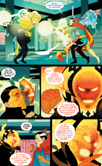 Todo este planteo de autosuperación tiene su clímax, a mi entender, en el número en el cual nuestro protagonista es visitado por Dormammu, por supuesto. Su peor villano, uno de los terratenientes más importantes de las regiones oscuras y por sobre todas las cosas, tío de su amada esposa. Dormammu entra al Sanctum Sanctorum con la soberbia de quien se cree ganador y de a poco Stephen se lo va a comer en un panchito, recordándole una a una cada una de las vergonzosas derrotas que tuvo. Un número realmente muy entretenido de leer y que da cuenta de que el equipo creativo hace honor y rinde tributo a la enorme y vasta historia del personaje, el cual hace años dejó de ser de la B y se transformó en uno de los pilares de la editorial.
