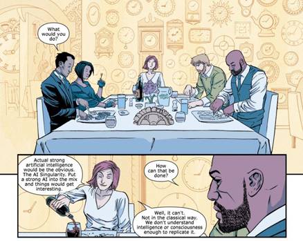 Después de pasarse un par de semanas tirando ideas y elucubraciones, el equipo termina por crear una consciencia no-biológica y no-física que es capaz de responder al medio ambiente y sus exigencias utilizando la estrategia de Simeon, la inteligencia de Maria para superar cualquier problema, los procesos de razonamiento de Vivek y la capacidad para construir cosas de Brigid, con la base de Robin para la concepción de nuestra realidad. Eso es Injection, una entidad viral que si bien originalmente fue “programada” en un lenguaje determinado y lanzada a la web para que modifique ciertas cosas dentro de la misma y logre torcer el rumbo del futuro, por supuesto terminó por trascender ese medio y esa sub-realidad y se elevó por encima de la misma, escapando del control que originalmente tenía la UCCC sobre ella.
