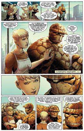 Zdarsky es mucho más inteligente de lo que yo podría esperar para llevar adelante este título, y juega a dos puntas. Por un lado, a sabiendas de lo que los lectores también saben (que efectivamente el resto de los Fantastic Four no está muerto como todo el mundo ficcional cree), arma una interminable saga aventurera de búsqueda en base a de una mentira, y por el otro, se anima a meterse con la mismísima génesis de los poderes de esta familia como casi ningún otro autor lo hizo, estableciendo una relación única y fresca entre estos personajes, casi a la par de las modificaciones que realizó Straczynski en Spider-man años atrás. Paso a explicar.