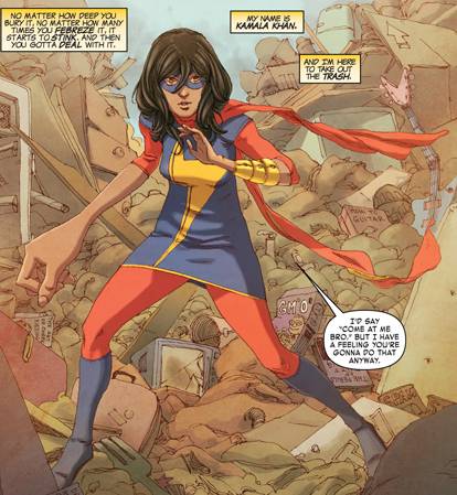 Olvídense de todo lo que sabían sobre Ms. Marvel hasta el momento, olvídense de Carol Danvers, de Binary, Warbird, Captain Marvel o como carajo se llame hoy en día… Hay una nueva Ms. Marvel en New York, y es musulmana. Bueno, técnicamente lo que acabo de anunciar no es del todo correcto y requiere un par de aclaraciones: las aventuras de esta nueva encarnación de uno de los personajes femeninos más fuertes del universo Marvel se desarrollan en Jersey City, una pequeña ciudad a 20 kilómetros de Manhattan, que es la distancia que hay desde el microcentro porteño hasta Haedo, como para que se den una idea, y si bien sus padres son pakistaníes, y toda su familia –ella incluida- están apegados a los designios dictados por el Islam, la realidad indica que hay poco y nada de esta religión monoteísta dentro de las aventuras de esta adolescente de apenas 16 años, o como mínimo el Corán y sus sagradas escrituras no tienen la suficiente relevancia dentro de las tramas como para preocuparnos por la especificidad étnica de este comic.