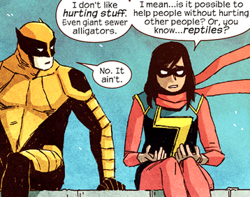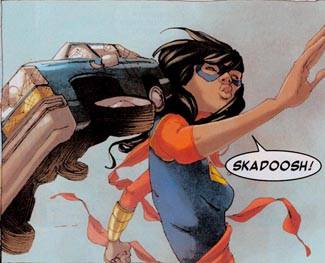 Más pronto de lo que el lector se lo espera caeremos en la cuenta de que existen enormes diferencias entre esta Ms. Marvel y la clásica, que van más allá incluso del escultural e imposible lomo de nuestra heroína de antaño: los poderes de Kamala están en el orden de los de un cambia-formas, incluyendo la posibilidad de poder extender sus extremidades e incluso agrandar partes de ellas –los puños, por ejemplo- para amedrentar al villano de turno con potentes golpes. También tiene un factor de curación, limitado, y que le va a costar aprender a balancear, porque está directamente relacionado con su poder principal, y si abusa demasiado de ambos puede incluso llegar a perder el conocimiento. Evidentemente la vida de una heroína musulmana no es sencilla.