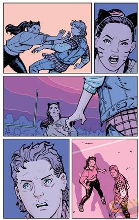 La salvedad de lo trillado de la propuesta, por supuesto, tiene que ver con los artistas involucrados: Vaughan no te sirve nada en bandeja y se deleita desarrollando conflictos interpersonales que muchas veces ponen la subsistencia de los personajes en jaque, y su co-equiper, Cliff Chiang, aquí está en su salsa y vuelve a pelar chapa de tremendo narrador como ya lo hiciera en la serie de Wonder Woman del 2011 comandada por Azzarello. A diferencia de su experiencia previa en DC, aquí pudo explotar su potencial desde cero, desarrollando el diseño de todos los personajes y elementos exóticos involucrados, y el resultado es gratamente sorprendente. La sencillez de sus trazos prácticamente desprovistos de sombras requiere un colorista a la altura del desafío, y es ahí donde entra Matt Wilson, con una paleta de colores pasteles muy amigable que termina de cerrar el clima y la iluminación idóneas para este comic.
