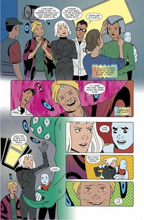 Cuando nos introducimos en la historia de Shade, The Changing Girl nos enteramos de que existe un nuevo personaje en Meta llamado Loma que es admirador (¿o admiradora…?) del poeta Rac Shade, y a través de sus escrituras y enseñanzas puede que haya comenzado a agarrarle cierto cariño a ese primitivo planeta tierra en el cual el afamado artista pasó tantos años durante su exilio auto-impuesto. Así, con la colaboración y complicidad de un amigo-amante, logra robar de un museo el mismísimo chaleco-M y huye a la Tierra, con tan mala puntería que termina introduciéndose en el cuerpo de una adolescente llamada Megan Boyer que se encuentra en estado de coma producto de una sobredosis de drogas de laboratorio, o al menos eso nos sugiere Castellucci a medida que avanzan los números.