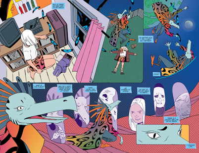 De hecho, cabe la posibilidad de que al comienzo el arte de Zarcone no termine de cerrarles del todo, pero a medida que avanzan en la serie se van a dar cuenta lo acertado de la elección, sobre todo cuando descubran la muñeca que tiene para ciertas magníficas composiciones de páginas donde los límites de los espacios dispuestos para la narrativa se diluyen y confunden con personajes u objetos. El mejor ejemplo de la destreza de esta mujer es su ausencia: el nº 7 de esta colección está enteramente ilustrado por Marguerite Sauvage, dibujante conocida por haber puesto lápices a muchos números de la serie “DC Comics Bombshells”, y si bien su estilo es muy agradable al ojo y sus diseños de personajes son una delicia, la casi completa ausencia de surrealismo y descontrol en su puesta de página transforman este interludio en una aventura plana y mundana, no muy distinta a un comic de Archie, por ejemplo, y muy alejada de la línea estilística que la serie mostraba hasta el momento. Y es una lástima, porque justo ese número es importantísimo y marca un punto de quiebre en la vida de Loma/Megan.