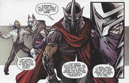 El resto de la historia es bastante parecida a lo que recordamos de los distintos orígenes que nos fueron narrados en comics, cartoons o películas para cine: el laboratorio es atacado por Ninjas del Foot Clan, April casi muere en dicha intrusión, pero la rata –la cual tiene el espíritu de Yoshi y ahora es bautizada Splinter- logra salvar el día y rescatar a las tortugas en un oscuro callejón de las afueras del laboratorio, en medio de una trifurca con ninjas y un gato. Accidentalmente los ninjas, en la huída, dejan caer unos compuestos químicos que se terminan mezclando y bañando a todos los animales, y en el quilombo Splinter logra alejar al gato de una de las tortugas, mutilándole un ojo, pero solo puede rescatar a tres de ellas y arrastrarlas a las alcantarillas. Por supuesto que estos líquidos extraños terminarían por afectar a las tortugas y a la rata, pero también al michifú, el cual se terminará transformando en Old Hob, un villano recurrente de nuestros héroes.