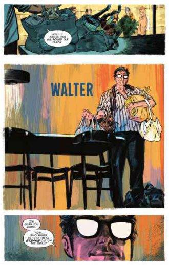 Si uno menciona a James Tynion IV en el ambiente comiquero lo primero que todos reconocen es su bastante digno trabajo en Detective Comics o Batman, pero la realidad es que el guionista desde hace años viene codeándose con el terror y el suspenso. Fue uno de los escritores de Hellblazer en el relanzamiento del personaje para la iniciativa DCYou y luego para Boom! Studios clavó 36 números de la genial The Woods y en el 2019 comenzó otra serie de terror, Something is Killing the Children, la cual aún no concluyó. Dicho esto, y habiendo leído todas estas obras recién mencionadas, no me tiembla el pulso al afirmar que The Nice House on The Lake es su trabajo más elaborado. Lo primero que me lleva a esta conclusión es la estructura narrativa que utiliza para contarnos los hechos: cada número tiene un pequeño prólogo donde al parecer uno de los «invitados» rompe la cuarta pared y le relata, desde un posible futuro, parte de los hechos al lector, invitándolo también a revivir un flashback del pasado en común que este personaje tiene con el enigmático Walter. Los recursos utilizados para armar este rompecabezas de relaciones entrecruzadas muchas veces podrán parecer toscos, pero son efectivos. Por ejemplo, asignarle a cada personaje invitado un nombre clave relacionado con su profesión o su hobby principal y un logo, esto nos permite a los lectores relacionar de forma mucho más visceral el cuadro que nos quiere pintar Tynion IV, y en algunos casos tiendo a creer que ese «apodo» es un poco peyorativo.
