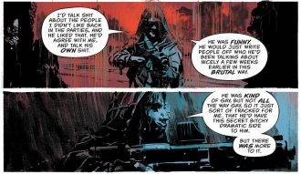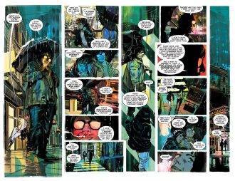 Lo que sin dudas hace una enorme diferencia entre esta propuesta y otras muy parecidas es el color de Jordie Bellaire, una artista que paso a paso se posicionó como la mejor de la editorial en esta área. Las hermosas paletas de colores con las que trabaja proyectan exactamente el clima que cada escena requiere, y la facilidad con la que cambia de tonalidad sin que esto resulte chocante no deja de asombrarme. No utiliza colores «claves» para ciertos personajes ni necesita decantarse por lo obvio para resolver escenas de tensión y encuentra siempre la forma idónea de colorear lo ilustrado por Álvaro Martínez Bueno, de manera tal que las transiciones surjan de forma natural, y no por esto deja de sorprender a cada página. Y con esto no estoy desmereciendo para nada la labor del eximio dibujante español (que me remite todo el tiempo al mejor Sean Phillips), pero lo que logra Bellaire en cada página me renueva el amor por este medio, así de simple.