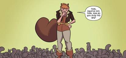 The Unbeatable Squirrel Girl, como les mencioné más arriba, es genial, lo mires por donde lo mires. Es un comic con aire indie inmerso dentro de la cronología de esta enorme editorial, pero vale advertir que aquellos que se tomen esto muy en serio y no puedan relajarse ante lo que están por leer la van a pasar mal. Son el único tipo de lector que no podría permitirse disfrutar de esta serie: los que vanaglorian la santísima cronología y se jactan de su prodigiosa memoria, superior incluso a la de los mismos editores de las editoriales. Imaginen esta serie como aquella gloriosa etapa de John Byrne en She-Hulk, donde el personaje no temía romper la cuarta pared para abrir una línea de diálogo con el lector y se la pasaba entonando monólogos muy divertidos en voz alta. Si, lo sé: hay otro personaje muy popular de esta misma editorial que cuenta con algunas de esas características –si no todas- y que recientemente incluso tuvo un protagónico en la pantalla grande… la película es genial, no hay discusión posible al respecto, sin embargo sus aventuras en el papel son olvidables, no se me ocurriría nunca utilizarlo como referencia.