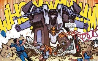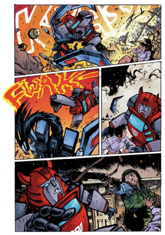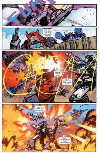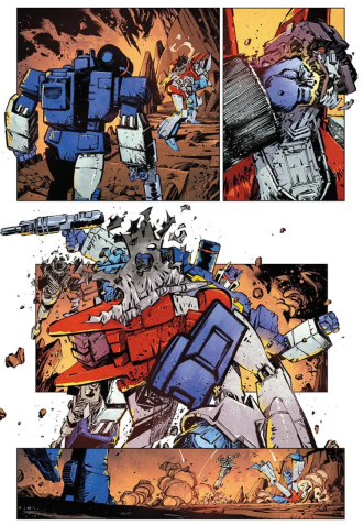 Si en algo no decepciona esta serie es, por supuesto, en el dibujo. Aquel que conoce los trabajos previos de Daniel Warren Johnson sabe de su capacidad para transmitir escenas explosivas, repletas de dinamismo, potencia y una narrativa feroz y muy vertiginosa. Pero es muy complicado transmitir lo mismo cuando tus personajes son armatostes tecnológicos repletos de partes (aún en sus versiones más sencillas que casi emulan los juguetes de Hasbro) que no solo se mueven de maneras ligeramente distintas a las de un ser humano sino que aparte se transforman en vehículos super reconocibles. El autor encuentra estos desafíos en cada página, y no solo los supera con elegancia, en muchos casos encuentra la manera más dramática e impactante de contarte esa escena, con planificaciones sorprendentes. Hay algunas splash-pages que son dignas del mejor poster que te puedas imaginar, sobre todo en el combate entre Optimus y Devastator, y cuando la acción se pone realmente frenética es cuando más nos tenemos que preparar para que suceda cualquier cosa.