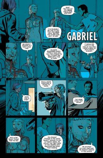 Me reservo el apartado final de la reseña para hablar de la faz gráfica de esta maravilla de serie que por el momento solo tiene cinco números en la calle. Los lápices y tintas corren por cuenta del español Fernando Blanco, quien demuestra una vez más el poderío y la presencia contundente que tiene la nueva ola de artistas españoles involucrados en el mainstream comiquero norteamericano. A este dibujante los lectores asiduos de DC seguro lo tienen ubicado ya que mínimo desde el 2013 viene trabajando de manera ininterrumpida, y pasó por series como Catwoman, Midnighter & Apollo, Universo Sandman: Lucifer, Phantom Stranger e incluso la celebrada Detective Comics de Batman. No voy a sorprender a nadie si opino que acá, en su primer trabajo creator owned, está dejando alma y vida. El nivel de expresividad que logró con los personajes es fantástico, casi tanto como el enorme trabajo que vemos en lo narrativo, para armar un esquema de páginas tradicional con una grilla por momentos bastante dura pero que jamás se sienta monótono. Al trabajar con dos tiempos distintos y un mismo grupo de personajes es importante tener muy presentes ciertos rasgos de cada uno de ellos, así como también el paso del tiempo y cómo se ve reflejado de manera distinta de todos ellos. Blanco le pone especial atención a cada uno de estos detalles, y el diseño de personajes que presenta es impecable, y denota un entusiasmo y un cariño enorme por la obra. Y por supuesto cuando la situación se pone tensa, dramática o escalofriante el dibujante no se queda atrás y encuentra la manera de transmitir de forma intensa cada momento picante.