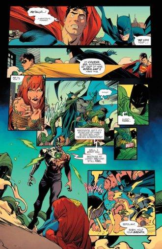 La calidez con la que te presenta a los integrantes de la Doom Patrol nos dicta el tono exacto en el que se van a desarrollar las secuencias siguientes, y en contraposición con esto, la dureza y el aspecto amenazante del Metallo lo plantan claramente como una amenaza que requiere toda la atención posible. Los rostros de malestar de Robin y Supergirl cuando se enteran que tienen que formar un Team-Up son, una vez más, otro guiño al lector más despierto; y para poner en marcha este tipo de referencias y que funcionen bien y de manera orgánica dentro de la trama necesitás un artista con el talento de Dan Mora, no queda otra.