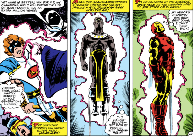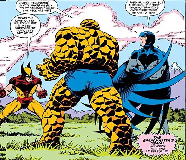 A Gathering of Heroes, el primer capítulo, arranca con la imagen de 40 cabecitas de personajes flotando entre dos entidades cósmicas que se desafían a un juego. Parece que uno entró con la función empezada, pero al toque pasamos a la Mansión de los Avengers donde de la nada, los héroes desaparecen (lo mismo que pasará años después en Secret Wars, solamente que esta vez, los villanos se quedan). Las páginas siguientes nos muestran cómo van desapareciendo héroes rusos, los Fantastic Four, Alpha Flight, los X-Men, Heroes for Hire, Spider-Man, y ya a un cuadrito por personaje, repite la misma fórmula para 30 héroes marvelitas y hay una página de ocho cuadros que muestra cómo desaparecen héroes de otras naciones: algunos que ya existían (como la israelí Sabra, Peregrin de Francia) y muchos nuevos como Talisman de Australia, Shamrock de Irlanda, Collective Man de China, Blitzkrieg de Alemania y… Defensor de Argentina. Bueno, no festejemos que cuando actúa en el segundo capítulo se presenta ante She-Hulk diciendo “Señorita, soy Gabriel Carlos Dantes Sepulveda de Brasil, a su servicio” y es una especie de Don Quijote patético. Bueno, la historia sigue con una escena muy parecida a lo que será el encuentro de todos los héroes de DC en el satélite del Monitor, y tras varias páginas de charla y presentación entre los personajes, aparecen estas dos entidades que se dan a conocer como el Grandmaster y el Desconocido, el más antiguo de los Elders. Aparentmente el Collector murió en la saga de Korvac y el Grandmaster es el hermano que quiere que los héroes lo representen para poder revivirlo, pero si pierde, debe entregar sus poderes.