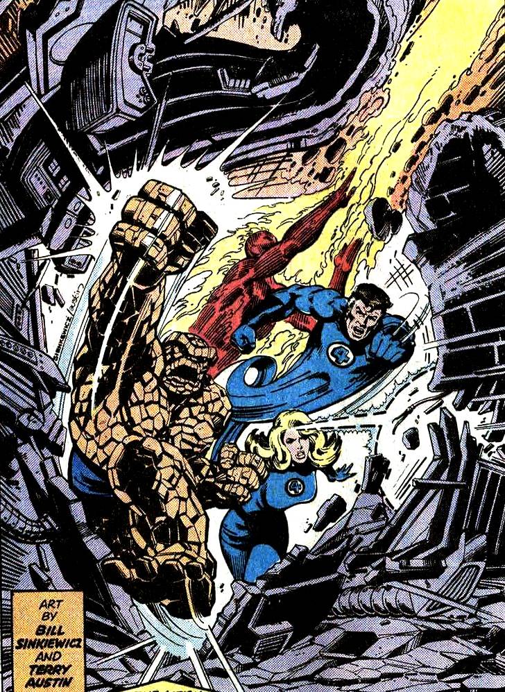 Informe: Enero de 1980 encuentra a los Fantastic Four en su número 214, la segunda parte de una aventura contra los skrulls, con Marv Wolfman como editor y guionista y John Byrne en los dibujos, contenido en el pasado kirbyano por las tintas de Joe Sinnott. En el 215 Wolfman introduce a Blastaar como regalo de despedida, ya que para el número siguiente tiene que entrar Bill Mantlo a terminar los diálogos porque Marv se calentó y se fue a DC; Pablo Marcos entinta un poco mejor a Byrne y Jim Salicrup se hace cargo de la coordinación de la serie por los siguientes 40 números. Mantlo en los guiones se saca de encima al robotito Herbie (217) y sufre horribles tapas de Al Milgrom y Sinnott. El nº 219 presenta al que tratará de ser el nuevo equipo creativo con Doug Moench en los guiones y un novato Bill Sienkiewicz en los dibujos, también aplastado por Sinnott. En el 220, el barbado dibujante de X-Men recuenta el origen de los FF, ahora a cargo de toda la faz creativa, excepto por el veterano entintador del título que sigue tratando de hacernos creer infructuosamente que Kirby está entre nosotros. Acá entra el Annual 15 con George Pérez entintado por varios artistas filipinos que no dan lo mejor de sí y un guion de Moench que trae al Captain Marvel. Lo más interesante del nº 222 (septiembre 1980) es que aumenta el precio de la revista de 40 a 50 centavos. Se repite el equipo creativo de Doug, Bill y Joe en historias bastante sosas hasta el 231 (Junio 1981) en que Moench y Sienkiewicz parten hacia Moon Knight y Sinnott a dar lástima por ahí.