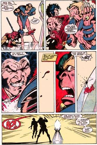 Arrancamos con Lost in the Funhouse, el Annual nº 11 Uncanny X-Men (de 1987 a cargo de Chris Claremont y Alan Davis), donde los mutantes se encuentran en el espacio enfrentados a un ser omnipotente gracias al cristal M’Krann y todos son exterminados. Esto indicaría que se terminó el título más vendedor de ese momento, si no fuera porque UNA gota de Wolverine cae sobre el cristal de los deseos cósmicos y a partir de ella se recompone todo el X-Man y trae de vuelta a sus amigos y le ganan al malo. Es obvio que en estos tiempos el tema del adamantium injertado no estaba muy claro, porque no tiene el menor sentido que se lo ponga de nuevo él solito, por más poder divino que tenga. Bueno, lo de la gota tampoco, seamos sinceros, no es lo mejorcito de Claremont.