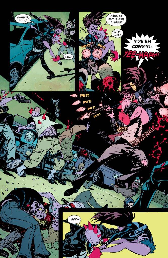 La miniserie inicial, publicada entonces en 1996 por Dark Horse, titulada “Body Bags: Father’s Day”, es muy sencilla. Básicamente la historia queda establecida en las primeras dos o tres páginas del primer número. A grandes rasgos: Clownface y Pops son dos “bodybaggers” (asesinos a sueldo), que fueron traicionados por un aliado, y salen en busca de venganza. En el interín, Panda, la hija de Clownface, llega totalmente de sorpresa, al mismo tiempo que les cae una nueva mission, y la chica decide engancharse a pesar de las protestas de los dos viejos. Ya con eso sabemos de qué se trata todo, y partir de ahí la acción se desarrolla en base a esa premisa muy sencilla. La gran habilidad de Pearson es lo que hace que una historia tan básica resulte tan tremendamente entretenida a lo largo de los cuatro números que dura este primer arco.