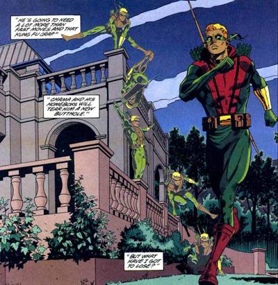La etapa del título de Flecha Verde (que era llevado por Chuck Dixon en guiones y Rodolfo Damaggio en dibujos), cuando se presenta y se erige a Connor Hawke como el nuevo Green Arrow, es uno de los runs más rescatables de todo lo que se publicó en los´90, particularmente dentro de las dos grandes compañías del mainstream yanki.