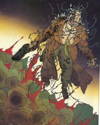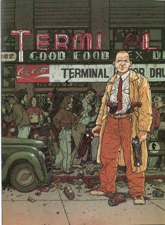 La historia que plantea Miller es muy sencilla, y está llena de lugares comunes de la ciencia-ficción, con influencias muy notables de obras como “Blade Runner”, “Robocop”, y “Ghost in the Shell”. Sin embargo no deja de ser un comic increíble, y la verdadera razón de eso, se encuentra en el lado artístico del mismo. El dibujo de Geoff Darrow, es sencillamente de otro mundo, y ya en la nota de “Big Guy” decía, pero lo vuelvo a repetir, porque vale la pena mencionarlo: Darrow es un tipo que dibuja todo con un nivel de detalle muy inusual para un dibujante de comics de EEUU, y que no tiene ningún tipo de limitaciones para el tipo de situaciones que retrata. Súmenle a esto una habilidad narrativa para jugar con los ángulos y las perspectivas de formas muy arriesgadas e interesantes, y se van a dar cuenta de que hablamos de un artista excepcional, que hace que aún un comic de lectura tan sencilla como éste, valga la pena. Cada página es un delirio, una locura ultra-violenta, super detallada hasta el elemento más inesperado, desplegado en visuales increíbles que muestran de la manera más minuciosa toda la destrucción y daño colateral resultante de cada persecución, tiroteo, y pelea en la que se involucra el protagonista. Darrow no se guarda nada, y si las escenas de multitudes dibujadas por George Perez en “Hulk: Future Imperfect” los impresionaron, prepárense cuando agarren esto, porque Darrow supera todo. Incluso se da el gusto de encargarse de que cada ínfimo personaje del fondo esté haciendo algo, en lugar de simplemente estar parado o caminando. Hay miles de pequeñas mini-historias protagonizadas por cada pequeño personaje de los fondos, y son tan locas y enfermas como la historia principal, por increíble que parezca.