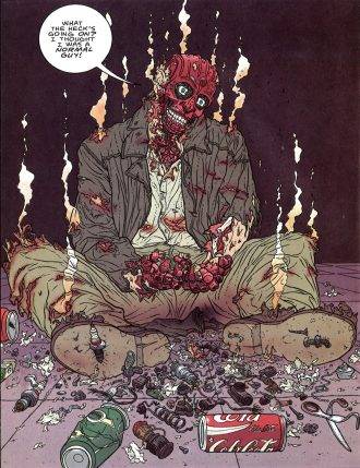 Originalmente publicada entre 1990 y 1992, como una mini-serie de tres números, “Hard Boiled” es una historia de lectura muy rápida, con un ritmo vertiginoso, que requiere de muy poco texto para contar un argumento en el fondo muy sencillo, pero que se va descubriendo a medida que avanza la lectura, y que en gran parte se cuenta a través de las espectaculares imágenes creadas por el genial Geoff Darrow. La acción sigue la accidentada y violenta vida diaria del personaje principal, un oficinista burócrata y padre de familia llamado Carl Seltz, que en realidad es un robot asesino llamado “Nixon”, al servicio de una corporación que lo utiliza para eliminar a sus competidores. Claro, la programación de Carl le impide comprender y aceptar su verdadera naturaleza como una forma de vida artificial, y a pesar de las miles de evidencias que se le presentan en el día, sigue convencido de que realmente es humano.