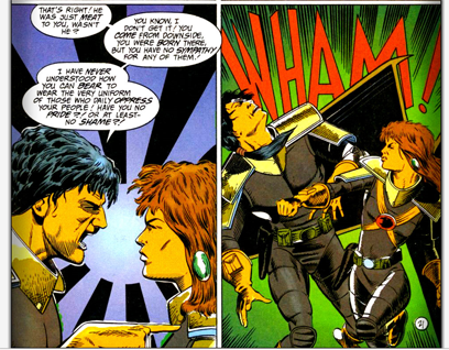 Hawkworld como ongoing tiene “la meta” de mostrar cómo se adaptan a la vida en la tierra los “recién llegados” Katar Hol y Shayera Tal (en 1990, a los originales de la Silver Age simplemente no se los menciona, como si nunca hubiesen existido; una retcon disparatada. Es por esa razón que eventualmente Truman se aleja de la serie regular, aunque declaró haber cobrado una fortuna por la Biblia del personaje que le hicieron hacer. Igual se bajó del proyecto y salió a defender a Ostrander: “John (Ostrander) hizo lo mejor que pudo, con esos mandatos editoriales y un concepto fallado desde el comienzo”). En cualquier momento re nombramos esta columna como “Hablemos de Ostrander” 😉