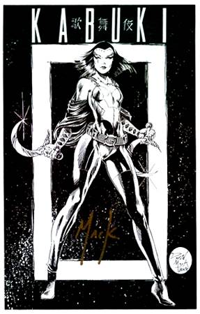 “Kabuki” se comienza a publicar en 1994 en la editorial Caliber, en un one-shot titulado “Kabuki: Fear the reaper”, (del que existe una edición “Ashcan”, publicada por London Night Studios) que narra la historia de una asesina que forma parte de un grupo llamado “Noh”, fundado por un exmilitar, conocido como “The General”, con conexiones tanto al gobierno como a las distintas organizaciones mafiosas de Japón, y que ha afianzado su poder a lo largo de los años en las más altas esferas. Dentro de este grupo, Kabuki es vista como una especie de “líder” o referente al menos, por las demás asesinas, aunque a partir de los hechos ocurridos en la primera mini-serie (“Kabuki: Circle of Blood) publicada en 1995 también por Caliber, y que se compuso de seis números en formato comic book, en blanco y negro, esa percepción de ella por parte de las otras, cambia por completo. A partir de los hechos allí narrados, que culminan con Kabuki moribunda frente a la tumba de su madre, tras haber desencadenado una serie de eventos caóticos que la llevaron a ser señalada como una traidora por el Noh, se les da la orden a las demás de buscarla y matarla en cuanto la encuentren. A partir de ahí, la historia avanzará muy lentamente, y podría decirse que en términos de cronología, no ocurre mucho. Sin embargo, lo genial de este comic no es la cantidad de cosas que ocurren, sino la habilidad magistral de su creador para dar vueltas mil y una veces alrededor de cada hecho desde distintas ópticas, para presentarlos desde los ángulos de cada uno de los personajes, y no solo de modo superficial, sino que se adentra en lo más íntimo de las vivencias de cada una.