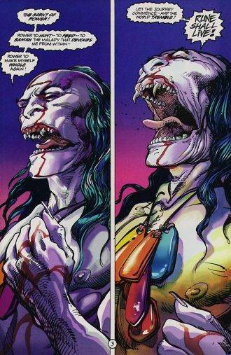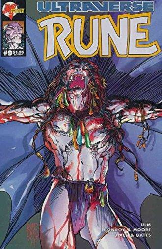 Rune es un título que combina misticismo, horror, ciencia ficción, conspiraciones, referencias tanto históricas como mitológicas, todo eso vislumbrado a través del arte de su incomparable creador. El volumen original de Rune se extiende a lo largo de un especial “ashcan” (una suerte de número preview que solía publicarse en los ´90) y nueve números mensuales, de los cuales, solo seis son dibujados por BWS, y son lo que realmente valen la pena. También hay un par de especiales y varias miniseries, pero principalmente son de la etapa marveliana de Malibu, por lo que la historia de Rune pasa a estar entrelazada con personajes del Universo Marvel, especialmente Silver Surfer y Adam Warlock. En mi opinión es un desperdicio, porque la historia de Rune tal como la había visualizado su creador, es lo que se ve en el primer arco de la serie original, desde el ashcan hasta los primeros 6 números de la misma. El resto no es más que relleno.