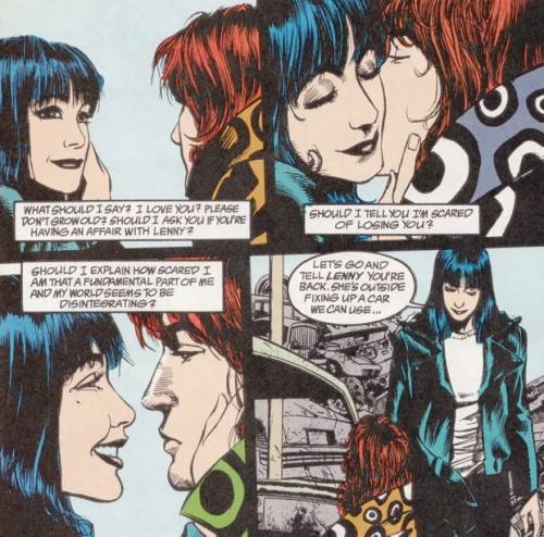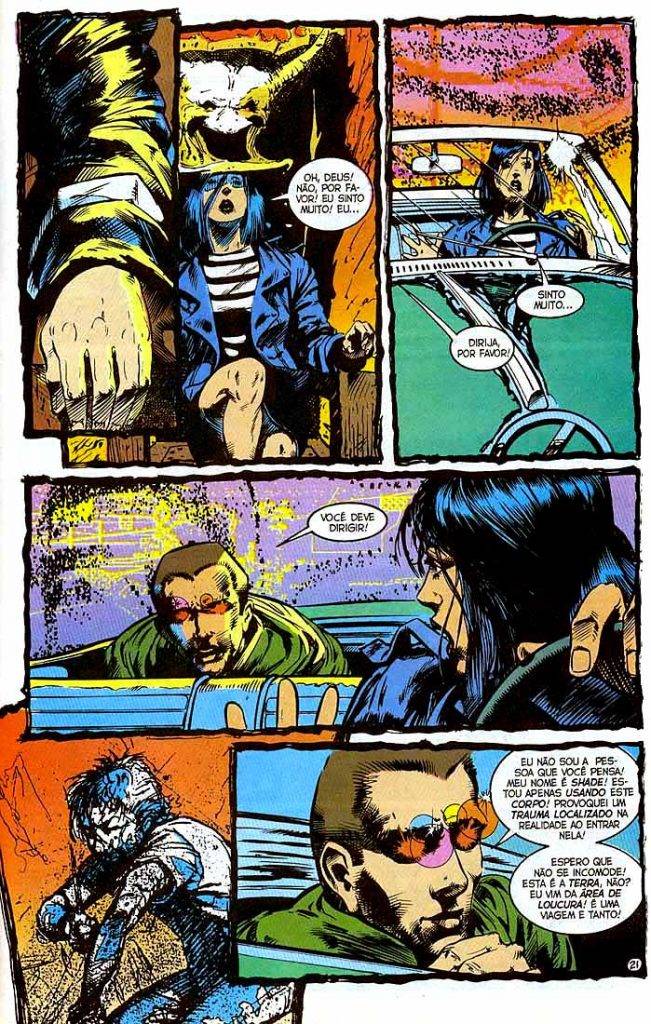 Shade es un pendiente en mi biblioteca, a la que -por los motivos que expone Lastiri- nunca me animé en inglés. Los tomitos de Zinco son una pequeña joya que por lo general se consiguen por dos mangos, se ve que por falta de demanda -lo mismo que pasa con la genialidad de «Skreemer»-. Y los de Planteta de Agostini que recopilan la historia entera, alguna vez los vi en una Feria del Libro con la ñata contra el vidrio, en mis épocas de mayor pauperismo. Esto no creo que jamás se reedite en el idioma de Cervantes, pero es algo que le compraría hasta a OVNI. El tramo inicial tiene todos los elementos que prometen una gran serie, un «road comic» con imaginación (la secuencia del escritor que investiga la conspiración en torno a Kennedy), oscuridad, crítica (los motivos del asesinato del novio de Kathy) y conflictos que muestran un Milligan intentando imponer una serie de autor en un mercado que glorificaba el Spider Man de McFarlane. Desconozco si la colección decae con el correr de los números -es un poco larga y puede ser que así sea- pero desde mi completa ignorancia- no sé por qué no suele ser reivindicada con el mismo ímpetu que -por poner un ejemplo- la «Doom Patrol». Será que Milligan no es Morrison, como Delano tampoco lo es, aunque a algunos (pocos) nos interpelen más ellos.